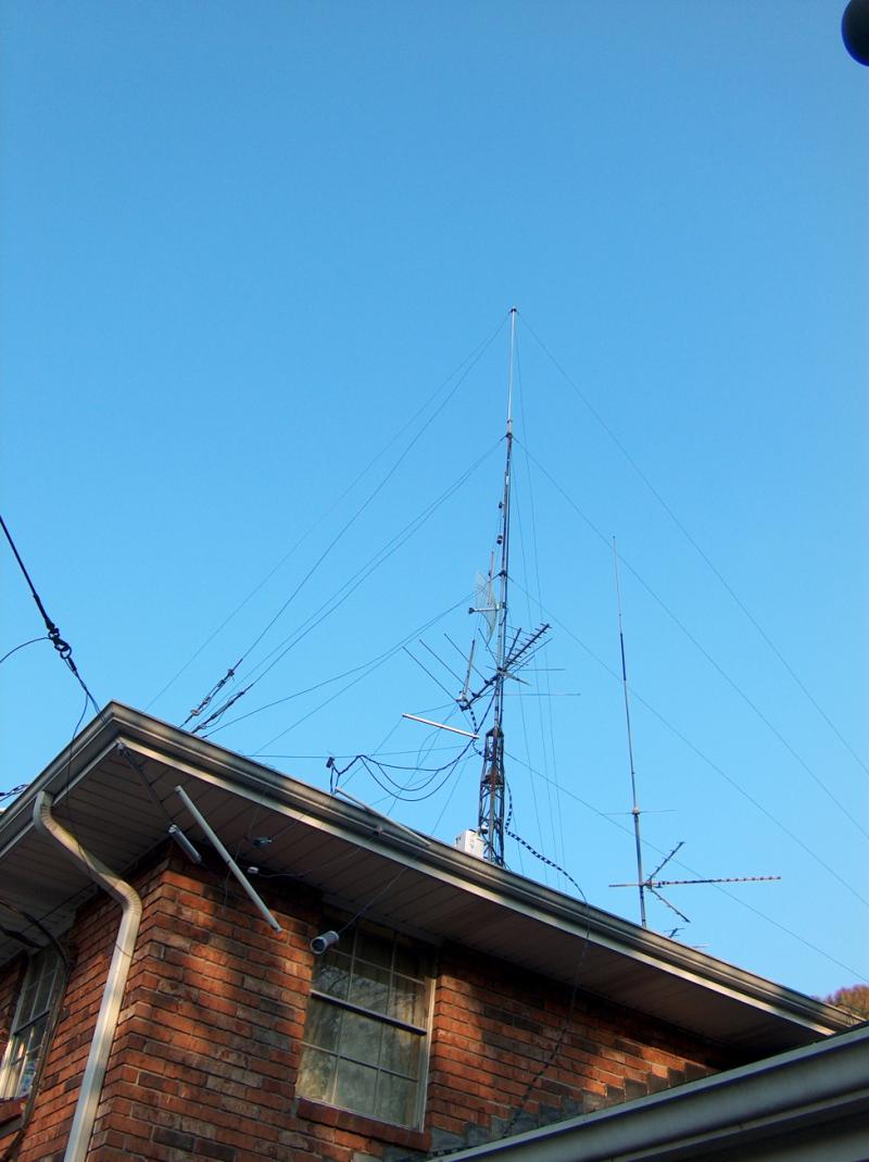 A ground view of the rooftop mast assembly. The mast survived OK. The remains of the W9INN dipole are visible draped across the roof. Although it looks as though the television antennas survived as well, in reality the insulators were cracked and split, and the rivets which are necessary for good electrical contact have all vibrated loose. The TV antennas had to be scrapped. The UHF TV antennas were OK. The G6-144 antenna suffered severe mechanical damage as well, and fell apart when I tried to take it down. However, it should be noted that I have had it in the air for almost 30 years!