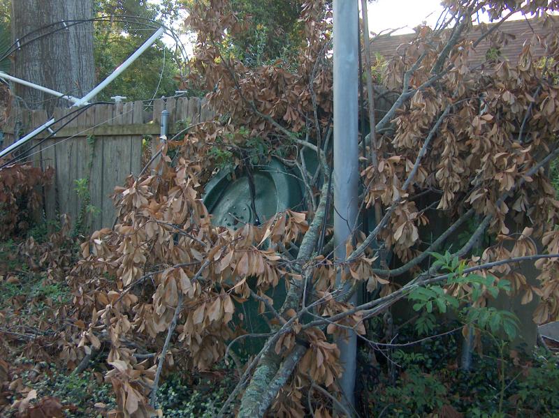 Looking down at the Big Branch that fell on the tower guy lines and caused the tower to collapse. My damaged LF loop antenna can be seen laying across the wooden fence.