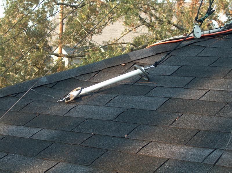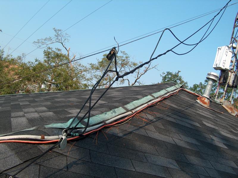 The wind whipped some of the Dacron support lines into a tangled frenzy. See the pine straw jammed under the wires on the roof? These came from a couple of pine trees over a block away from the house. On the North side of the roof, I found pine needles driven as far as 8 inches under the remaining asphalt shingles.