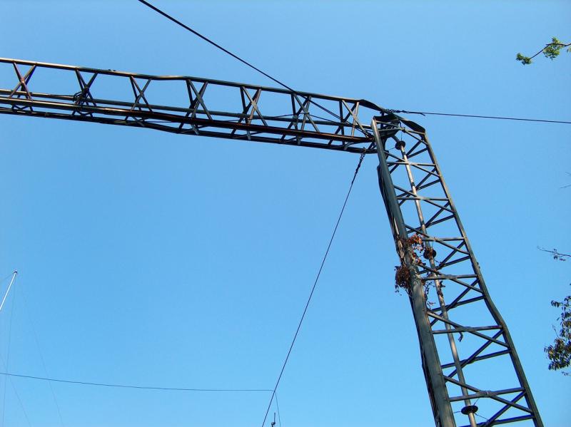 A view to the West of the failure point on the tower. Notice the tree branch caught in the tower bracing. It was blown there during the hurricane.