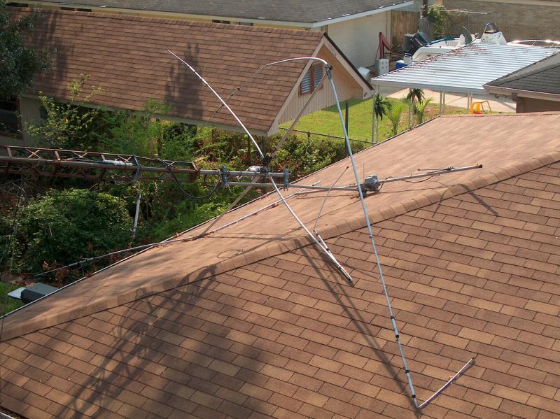 When the tower collapsed, the rotor that switched the two-meter Yagi from horizontal to vertical polarization punched a hole in the roof. When I removed the remains of the beam and tower, I installed a temporary patch over the damaged area