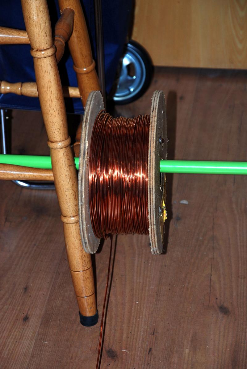 Construction of the coupling coil was started by running a broomstick through a roll of Bonnie, KB5YSE's art studio wrapping paper and supporting the roll between two wooden chairs. The roll measures about 9 inches in diameter, and made a solid form on which to wind the #10 AWG bare copper wire for the coil. The free end of the wire was simply taped to the roll of paper and winding was begun. After about 90 turns were wound on the form, the coil was carefully removed from the form and set aside for later installation.