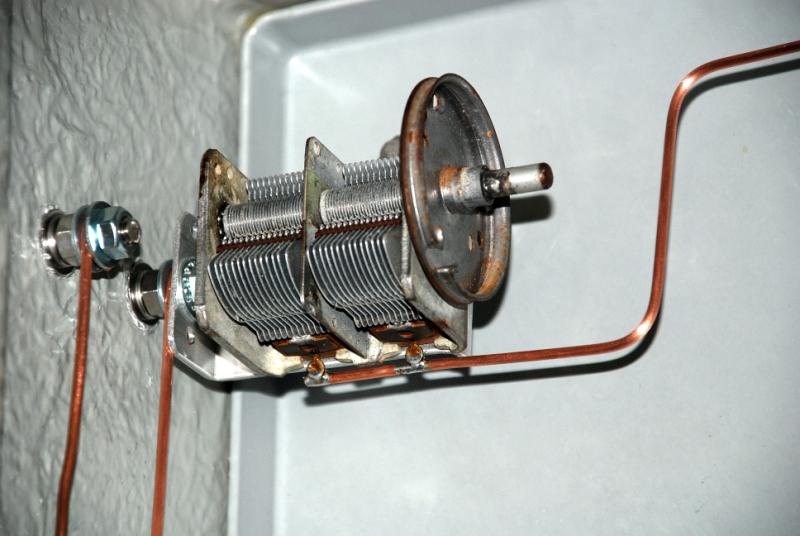 Both sections of the capacitor are in parallel, and connected to the wire leading off to the right of the picture. That wire goes through a ceramic feedthrough insulator on the right side of the enclosure and then connects to the hot side of the coupling coil.