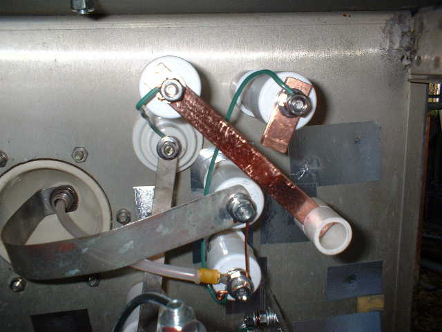 Since both the input and output leads from the RF ammeter are at the same RF voltage, I simply ran the Polyethylene insulated lead from the LF loading coil into the cabinet through the hollow tube in the center of the bowl insulator. This tube is actually the output connection terminal of the tuner. Note that the Poly lead comes in the cabinet, over to a standoff insulator, then via a copper wire jumper (this is where the RF ammeter will be connected) to another standoff insulator, then it exits the cabinet on the wide copper strap connected to the bowl insulator pipe connection.