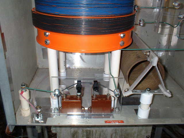 This view shows the LF loading coil mounted on top of the antenna tuner. The loading coil is supported about 6 inches away from the tuning cabinet and the tower. The presence of the cabinet and the tower do not materially affect the operation of the loading coil.