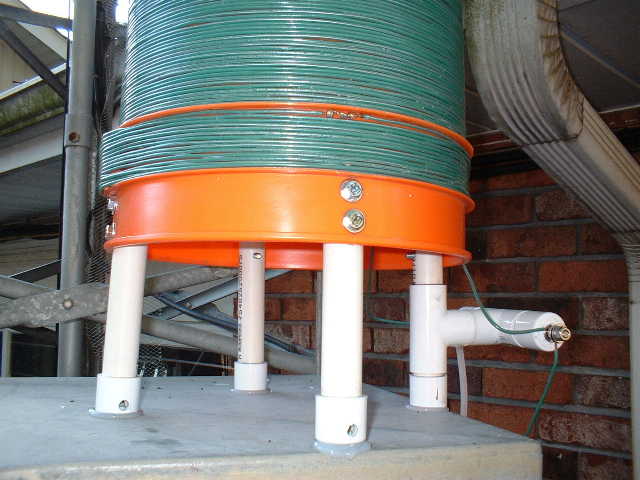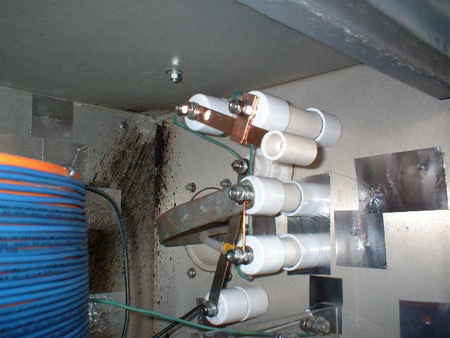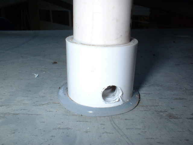 Did you notice that the top ends of the PVC pipe coil support legs were open? That means that they will catch rainwater and may cause leaks into the tuning cabinet. If you use this mounting method, be sure to drill 3/8 inch drain holes in the bottom of the legs, as shown here. Note that I have also applied RTV Silicone sealant under the legs where the mounting bolts pass through the tuning cabinet roof. Water and high voltage RF don't mix well!