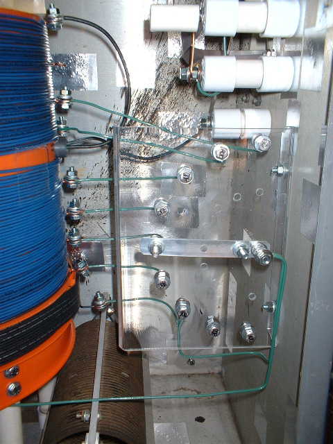 Another view of the LF loading coil mounted on top of the tuning cabinet. Look at the cheap but effective "T" insulator on the right hand leg. This insulator holds both the leads from the loading coil firmly in place.