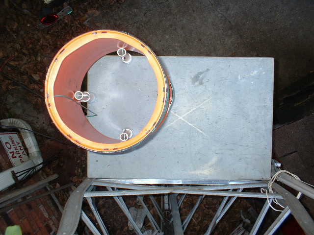 Since the bucket is tapered, the windings tend to slip off the end of the bucket unless you hold them in place. What I decided on was to install eight short sections of #14 wire on the narrow end of the bucket. These lengths of wire are simply passed through the bucket wall and bent back a short ways over themselves to fasten them in place. You can see the stub ends of the wires in the picture above. Note that the end of the winding passes through the bucket wall into the inside of the bucket and then goes to the antenna tuner. The wire is kept about two inches away from the inside wall of the bucket to prevent possible arcing and to reduce capacity across the coil.