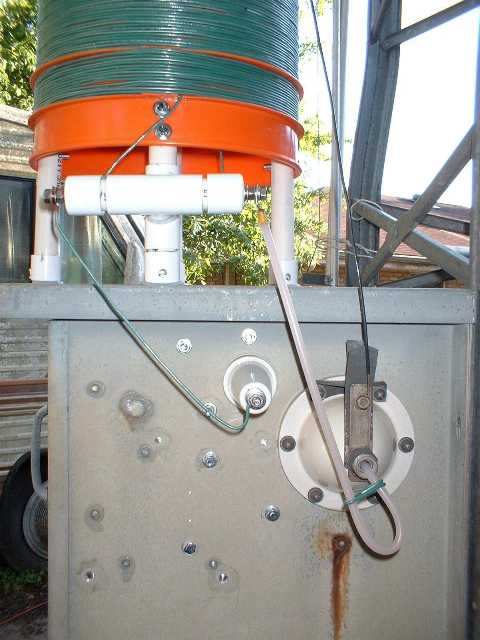Looking down at the top of the LF loading coil and the antenna tuner cabinet. I have cut the end out of the bucket. Here in south Louisiana, any nice, dry place, such as under an upturned loading coil bucket, tends to collect wasp nests in abundance. Hence, cutting the end out of the bucket may be regarded as an operator safety precaution! Notice that the top coil wire which eventually connects to the antenna, is spaced away from the bucket wall by several inches.