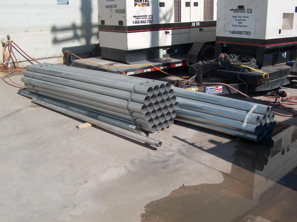 A stack of new electrical conduit tubing sits ready for installation.