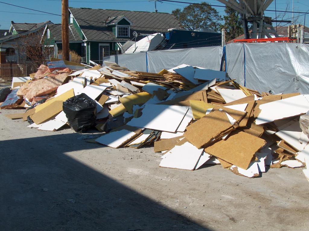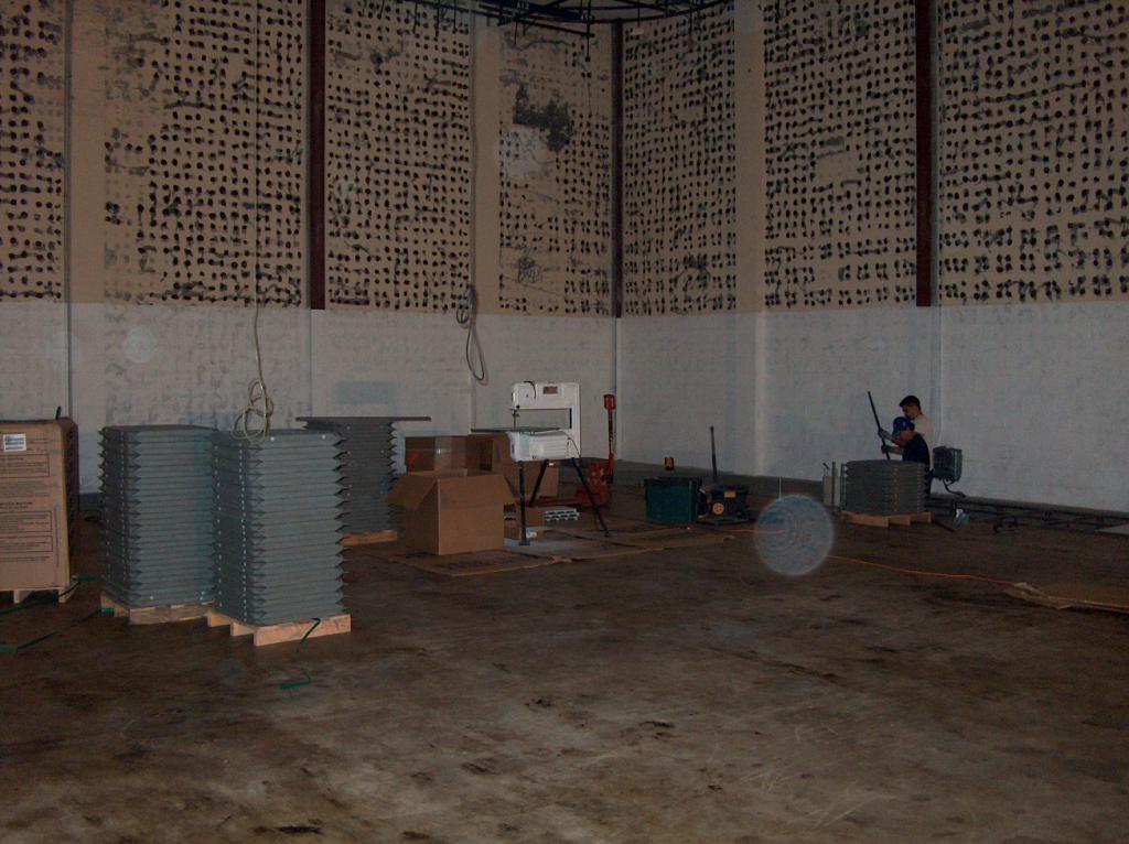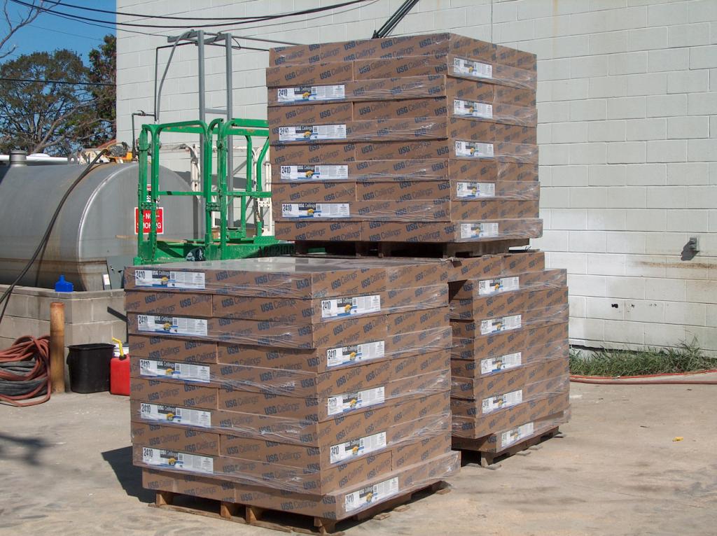 The first of several stacks of brand new ceiling tiles awaiting installation on the second floor.