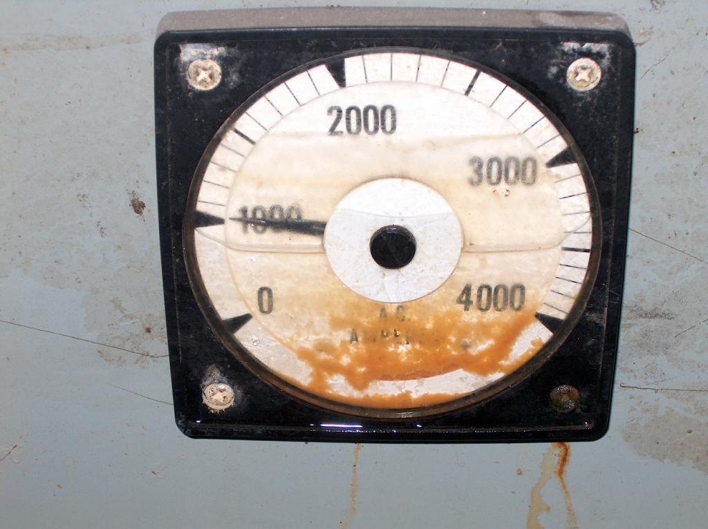 The meter on the old electrical panel is stuck at 1000 amps by the flood water. Note the water still inside the meter, and the gooey oil on the outside of the meter. Imagine the inside of the building like this and you have some idea of the mess that greeted the cleanup crews when they started work in the building.