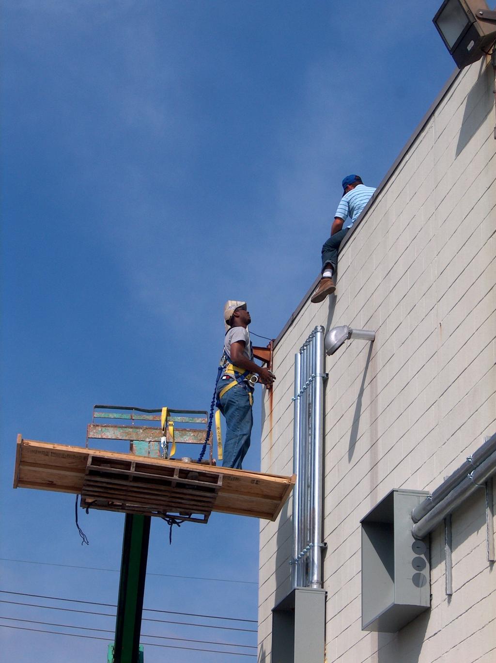 On the roof, the electricians are placing brand new conduit and wires for the air conditioning systems and the cellular building.