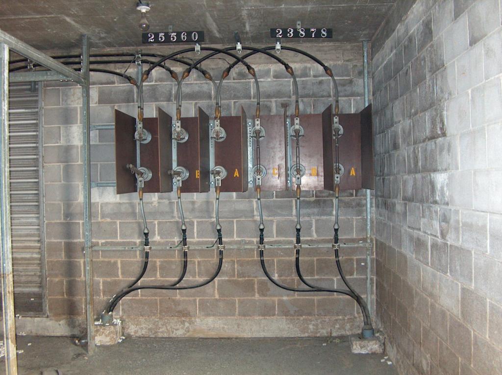 These are the old power busses from the transformer room to the old main power panel. Each red buss is made from five sections of solid copper bar. Each bar measures six inches wide by three-eights of an inch thick. The total power capacity of the busses is one megawatt, which could supply about one hundred houses.