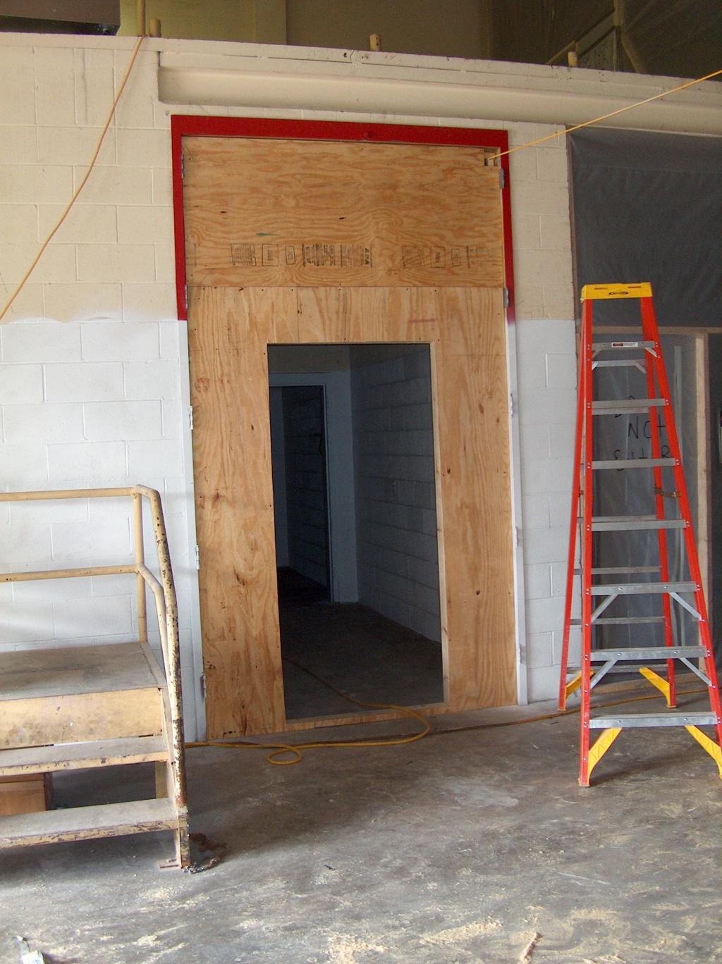 The first signs of rebuilding is the new door frame in what will become the temporary engineering office.