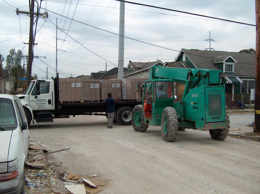 The arrival of some plywood signals the start of construction of the temporary work areas in the garage and main studio.