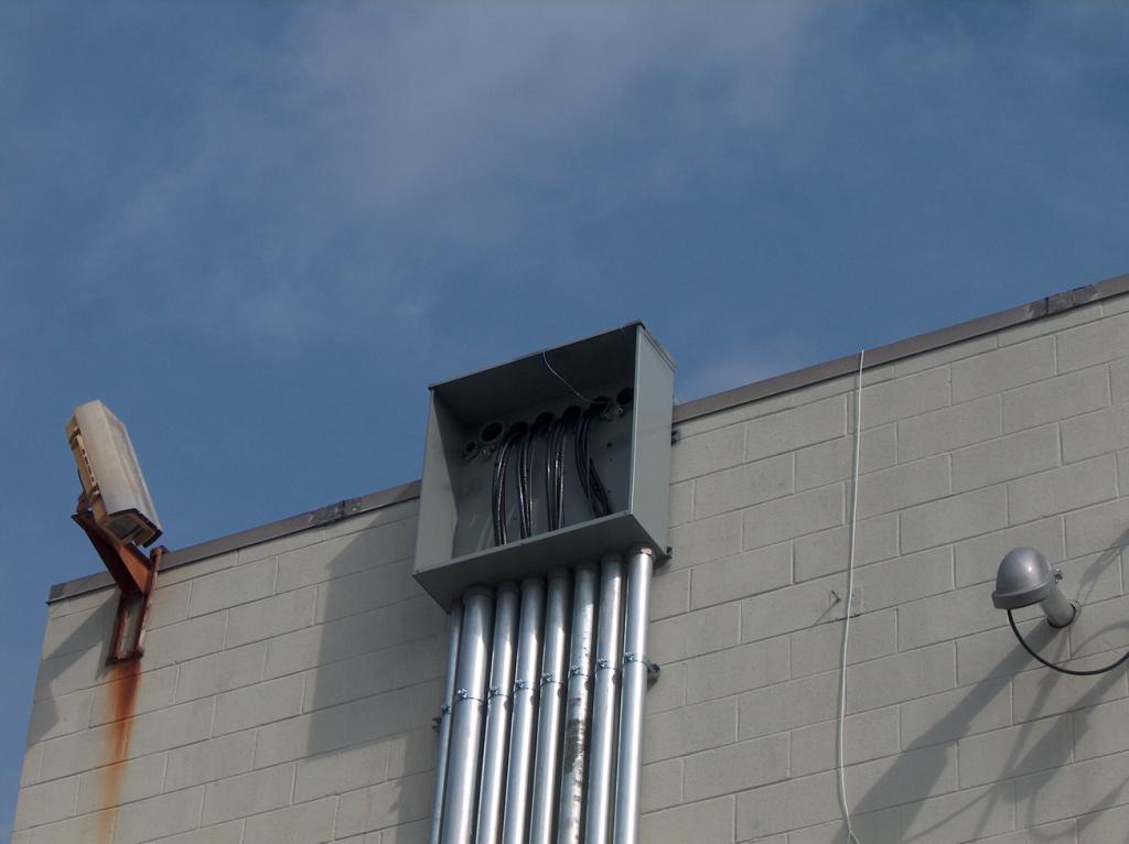 Holes have been cut through the outside wall of the building to pass the new conduits to take power from Entergy.