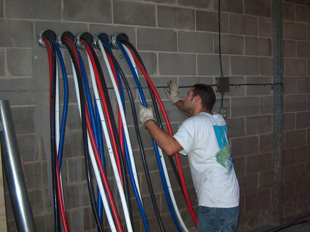 The electricians have pulled some of the air conditioner power wires into the breaker cabinet.