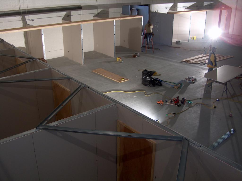 The carpenters are starting construction of the new temporary control room just outside the studio,. This was the old Purple Room.