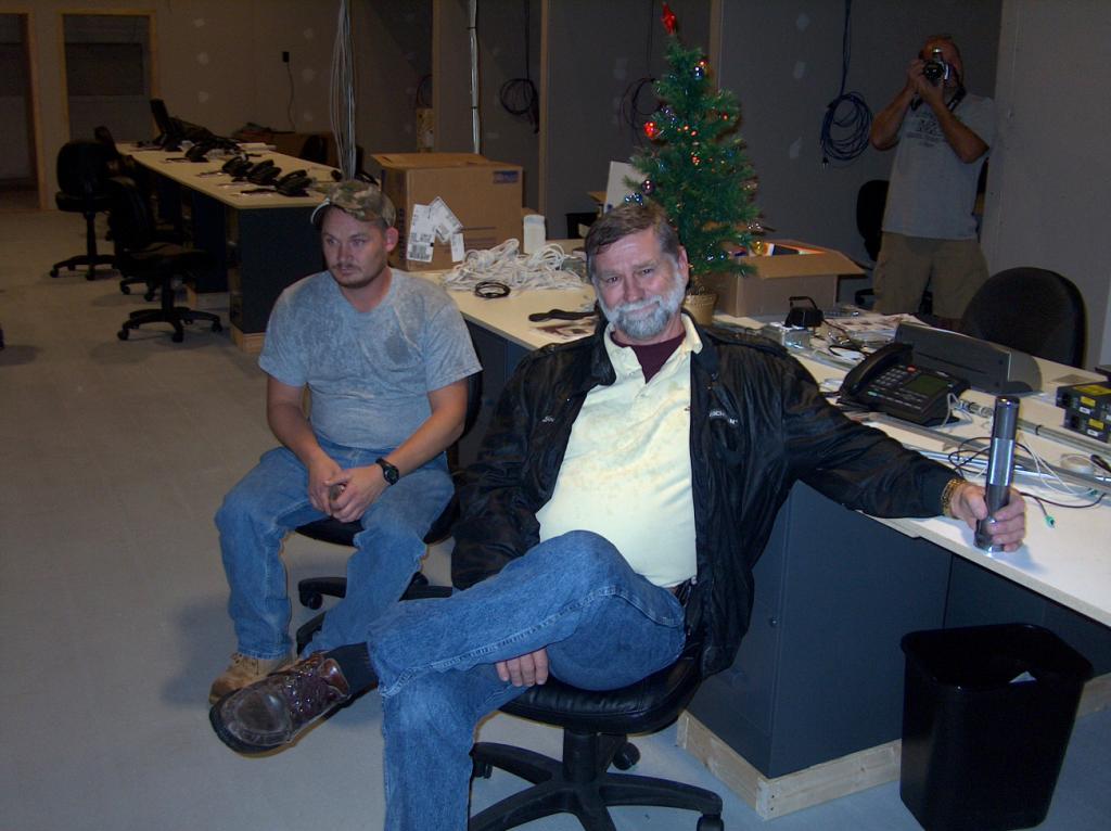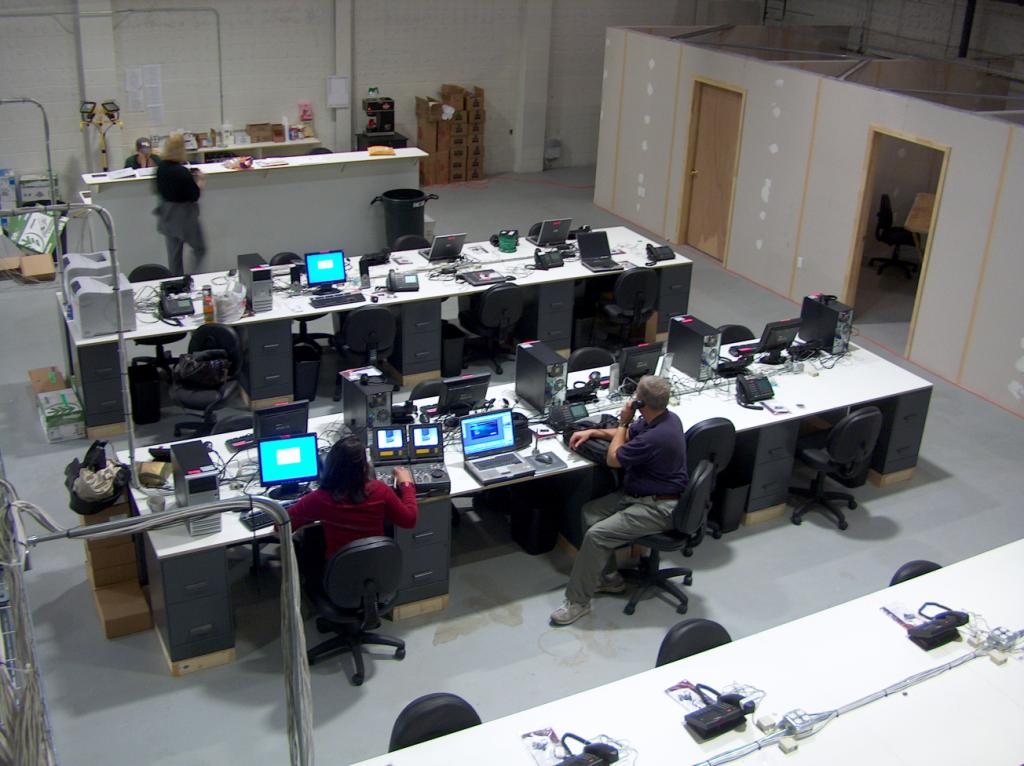 Meanwhile, the carpenters are assembling the desks and file cabinets.