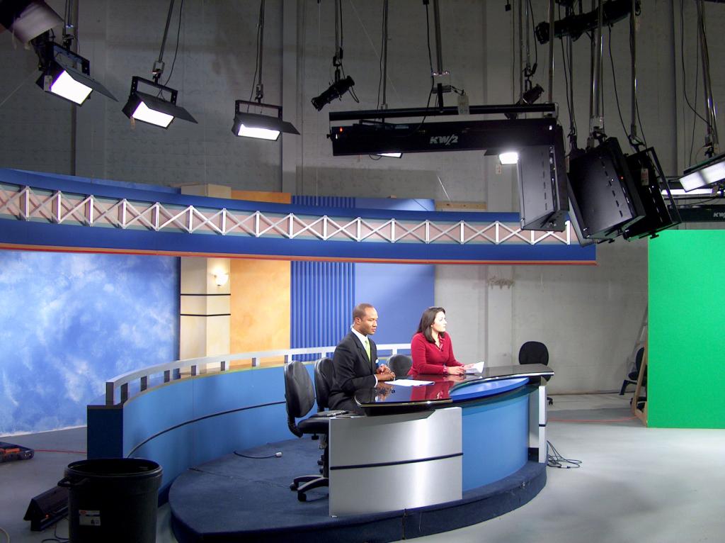 Getting the set and the lights ready for the first broadcast.
