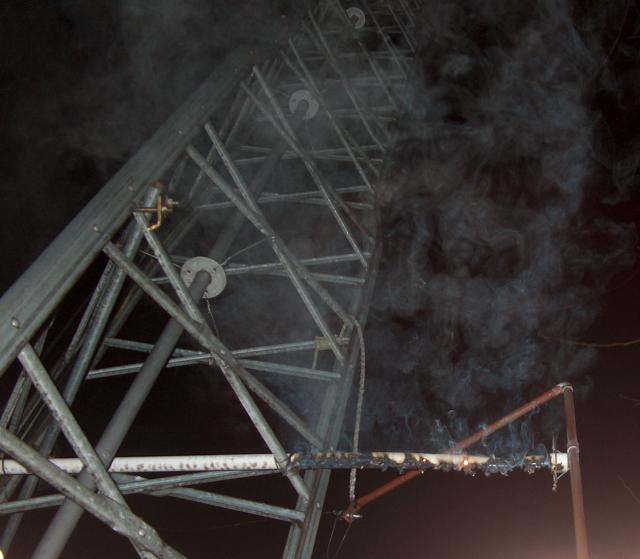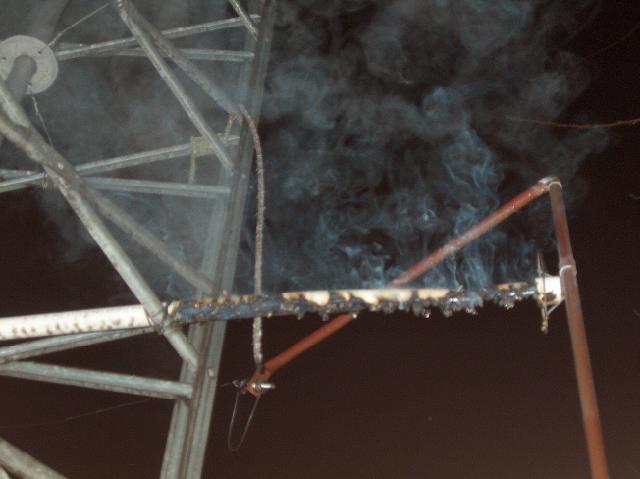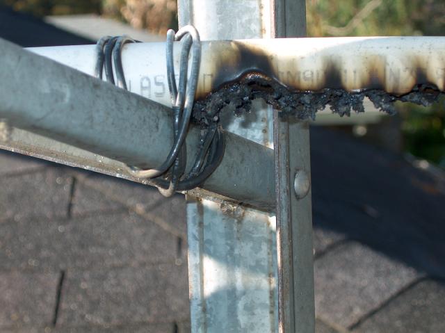 The key to successful operation of a radio transmission system is to keep all the smoke inside the various system components. WC2XSR/13 was doing pretty good in that department, until late on the evening of January 14, 2005. At about 2200 hours local time, the lower feed bar PVC plastic standoff insulator that holds the feed bar away from the antenna tower began to fail by arc tracking and thermal decomposition (it burned up). The insulator failure was discovered the next morning at about 0435 local time when I observed that the transmitters PA stage drain current had fallen to about 25% of normal. Attempts to retune the antenna using the remote tuning motor were unsuccessful. The VSWR remained very low, but the forward power was only about 100 watts. A visual inspection of the antenna system revealed what you see in the picture below!