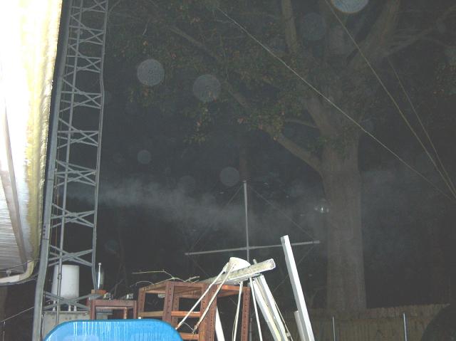 This side view shows the smoke from the burning insulator drifting off to the right into the early morning fog. This is very acrid and dangerous smoke, containing Chlorine compounds and Hydrochloric Acid gas. It can cause severe lung damage if it is inhaled.