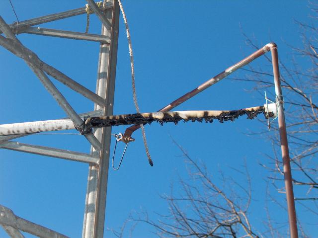 A closer view of the damage shows that the insulator failed across its entire length, finally forming a conducting path between the grounded antenna tower and the vertical copper feed pipe. Note the short section of plastic rope hanging uselessly from the right side of the tower. The rope was used to keep tension on the outer end of the thin-walled PVC support pipe.