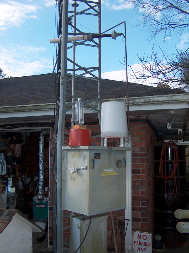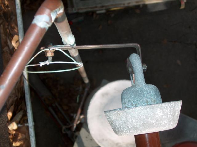 The cold end of the insulator. The ceramic rod of the new insulator is about 1.125 inches thick and about 14 inches long. Hopefully this will not allow the RF to track across it and damage the surface as it did to the PVC pipe. Notice the gray antenna tuning cabinet below the insulator assembly. On top of the cabinet is an inverted red plastic bucket which covers the motor drive for the variometer. I needed a way to keep the bucket in place so wind would not blow it off during storms. I also needed a way to keep my "RF Monitor Bottle" in place. The RF Monitor Bottle is the empty 2 liter soda bottle with a small fluorescent lamp inside it that is seen on top of the bucket. It lights up when the transmitter is on so I can have a visual monitor at night as well as a warning that the antenna system is "hot" when I am working near the tuner. I solved both problems by "recycling" a dead gel-cell battery. I cemented the RF Monitor Bottle to the battery and placed the bottle and battery on top of the bucket. Everything stays in place and is easy to remove as needed.