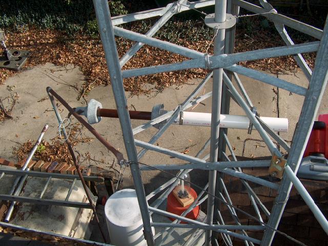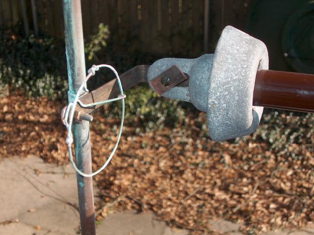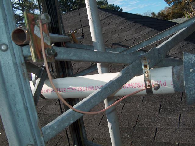 Looking down at the new insulator assembly you can see the metal screw (hose) clamps that hold the PVC pipe firmly against the tower leg braces.