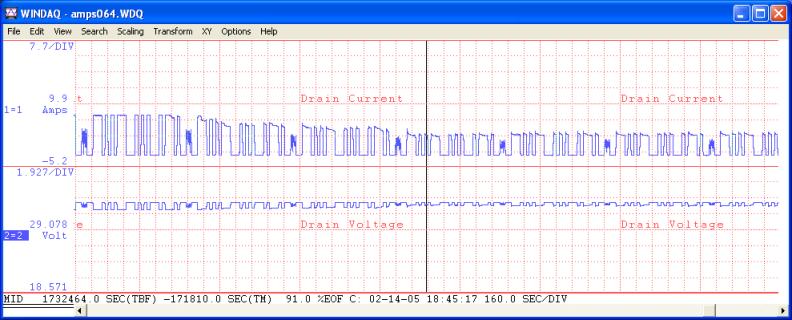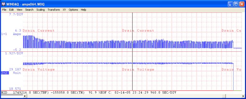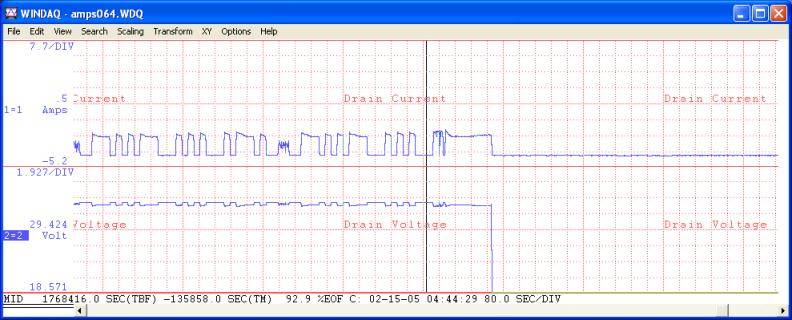 This is a graph of the final RF PA stage drain current (top graph) and voltage (bottom graph) over the period of the Big Burnout. The time period shown here is almost 5 hours.