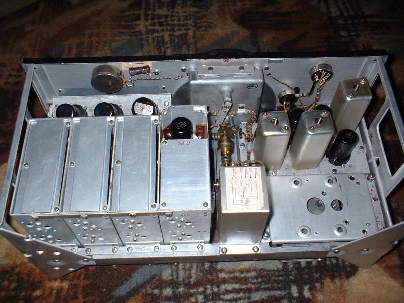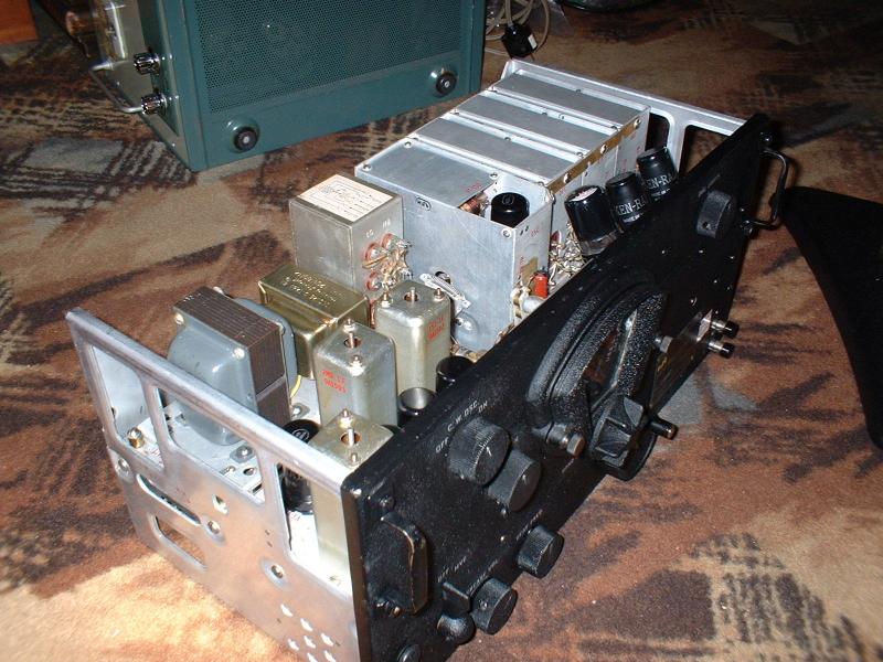 This is the way the receiver looked when I brought it home. I suspected that the radio had been modified internally, because when I received the radio, it came with an external power supply which was mounted inside a separate case along with a loudspeaker. The receiver itself was in fairly good condition for having been in storage for so many years. The previous owner had stored it in a bedroom closet, so the receiver was fairly well protected from the ravages of time and insect infestation. The front panel was somewhat faded, and the paint had quite a bit of dust adhering to it. Other than that, it looked pretty nice. But, what about the inside of the receiver?