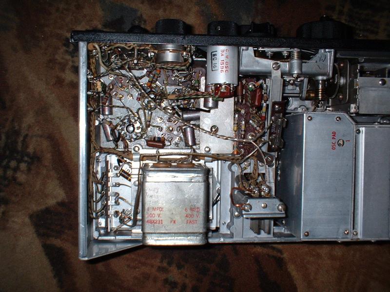 Sharp-eyed surplus buffs will quickly spot a couple of new wires and a rewired power connector in this view of the bottom of the receivers' chassis. The new high voltage rectifier diodes and wiring for the new AC power transformers are hidden under the two-section oil-filled capacitor visible in the lower left of this photo. Other than these useful changes, the receiver is unmodified.