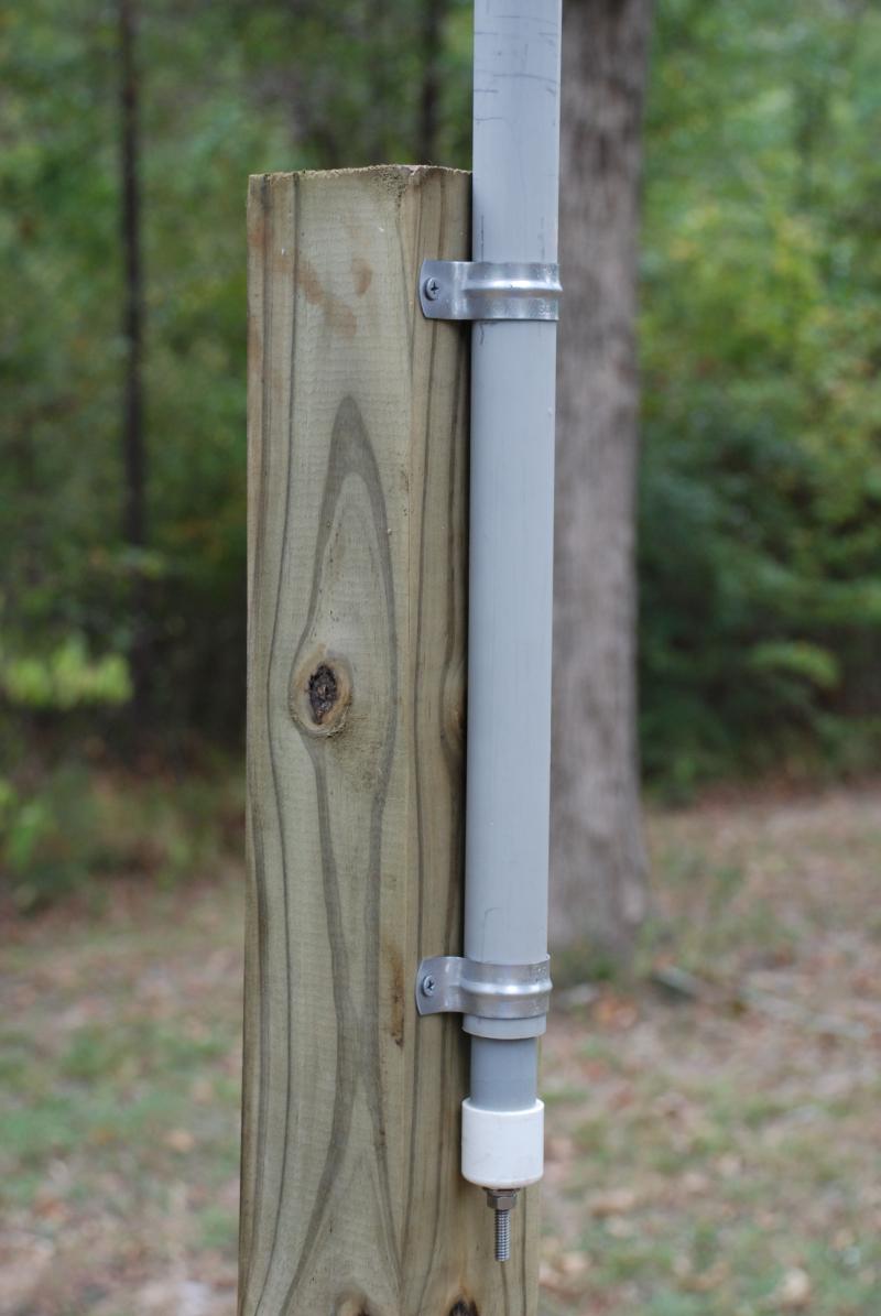 To prevent the PVC pipe from bending and breaking under wind stress, the lower end of the pipe was reinforced by slipping a length of the next larger PVC pipe over the antenna pipe. Standard pipe mounting "U" straps were then used to attach the antenna pipe to the mounting pole.