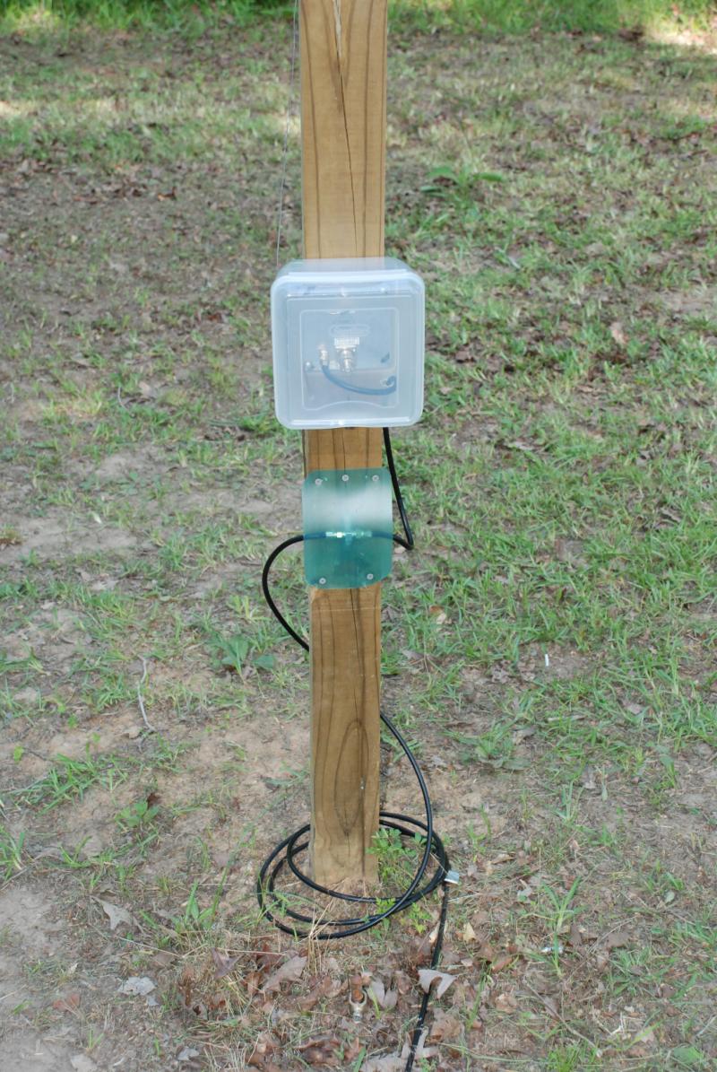 The amplifier is enclosed in a metal electrical box and then placed inside the plastic enclosure. (Note to self: Use a better quality plastic box the next time! This box deteriorated in two years time, and the hinge broke, allowing the cover of the enclosure to flop open.)