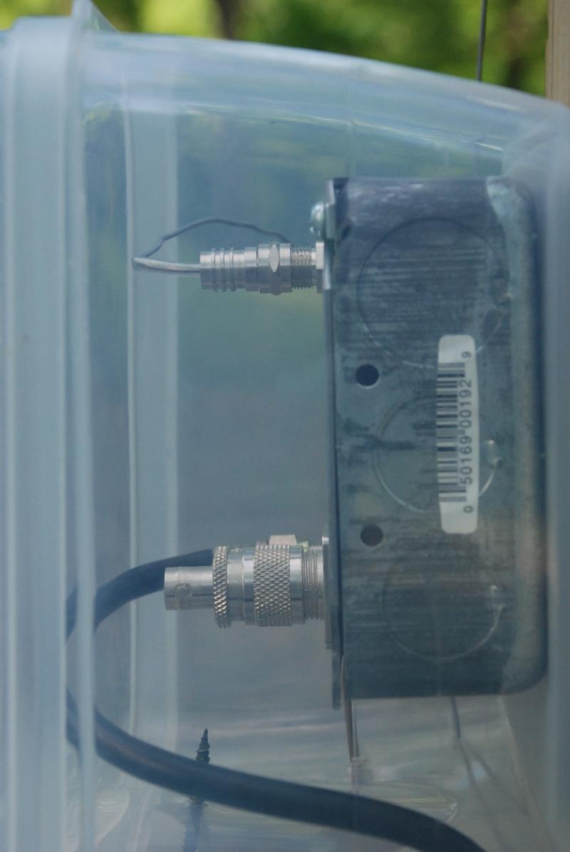 An 8 foot (2.45 Meter) copper-clad ground rod is driven into the earth at the base of the support pole. The coaxial cable between the amplifier and the ham shack is RG-6 TV coaxial cable. The amplifier and the shield of the coaxial cable from the ham shack are both connected together and connected to the ground rod. For ease in troubleshooting, the coaxial cable is spliced and fed through a standard TV cable grounding block. The ground block is located under the translucent blue plastic rain shield mounted on the support pole beneath the amplifier.