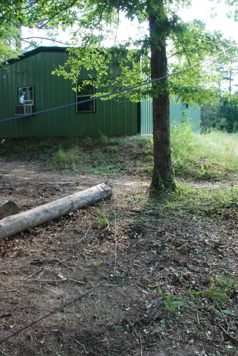 The antenna is almost invisible amongst the trees in this photo. The antenna's location is about 200 feet (61.2 Meters) away from the ham shack and slightly downhill from the ham shack. The coax cable from the antenna to the ham shack is simply laid on the ground and left there. RG-6 is cheap, so if it gets damaged, it is simple to replace it. The cable runs from the antenna up the hill to the left and then on to the ham shack.