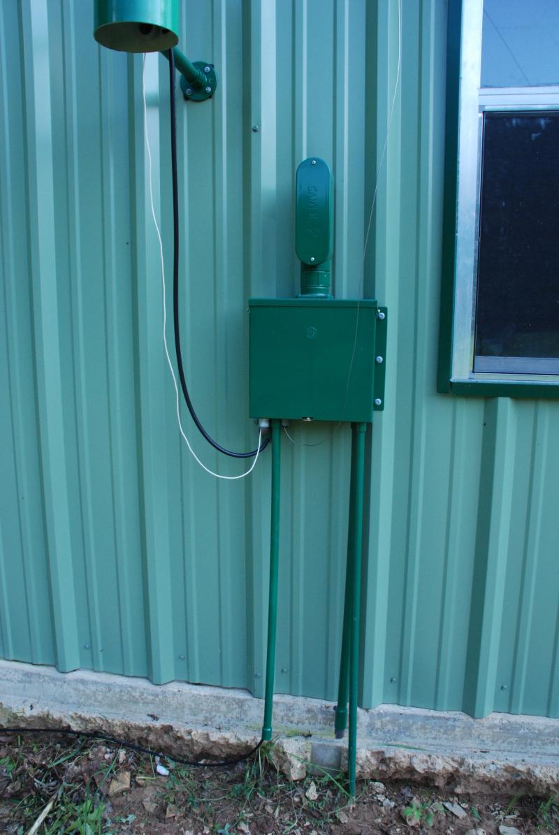 The cable runs along the ham shack foundation until it reaches the cable entry box on the wall of the shack.