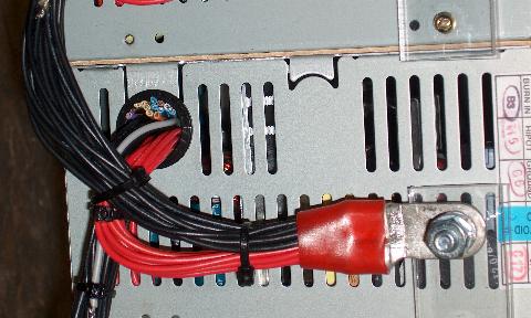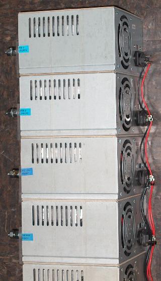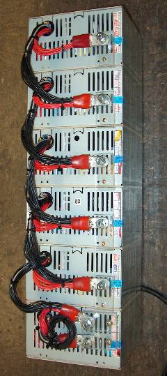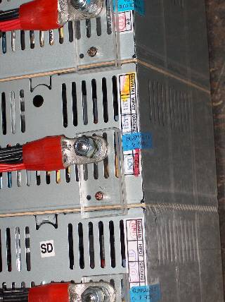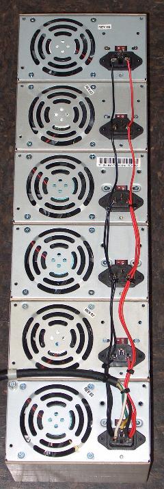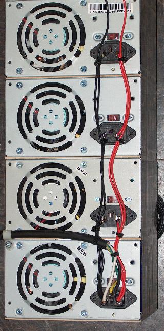 The business end of the power supplies. Note that all of the red and all of the black wires have been connected together to form a (+) and (-) cable from each supply. you can see that the black (-) lead of the bottom supply is free. It is the negative end of the Tower of Power. It is also connected to the case of the bottom supply. The case of the bottom supply is also connected to earth ground through the power cord. note that none of the other supplies have their cases grounded as they are all above ground potential.