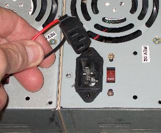 The mains connector going to the top supply. Note that it has only the mains wires connected to it. The ground lead is not connected.