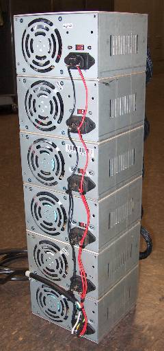 Here's the assembled Tower of Power. Six supplies in series make 30 volts at 35 amps - that's a total of 1050 watts! Taps are available every 5 volts from 5 to 30 volts.