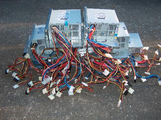 These surplus Dell power supplies were chosen for a very good reason - I got them for free, and I got a LOT of them. A bonus was that I discovered that these did not need a standby load connected to the supply to keep them running - just apply mains power and close the Start lead to ground.