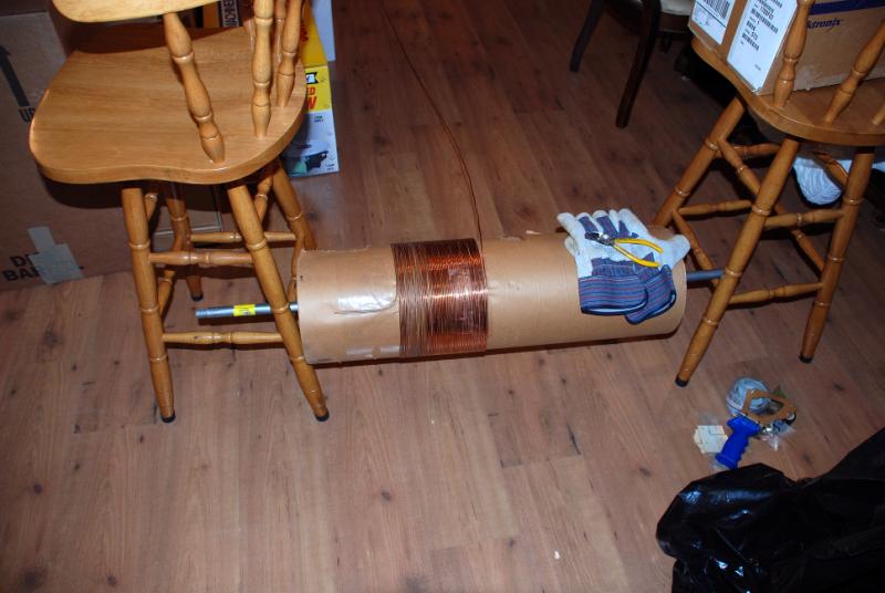 Construction of the coupling coil was started by running a broomstick through a roll of Bonnie, KB5YSE's art studio wrapping paper and supporting the roll between two wooden chairs. The roll measures about 9 inches in diameter, and made a solid form on which to wind the #10 AWG bare copper wire for the coil. The free end of the wire was simply taped to the roll of paper and winding was begun. After about 90 turns were wound on the form, the coil was carefully removed from the form and set aside for later installation.