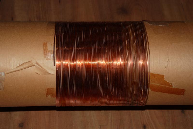 The wire I used was left over from a commercial AM broadcast antenna installation I did many years ago. It is bare, soft drawn, #10 AWG pure copper wire. It was just right for a coil of this size, since it is strong enough to hold its shape without any extra support.