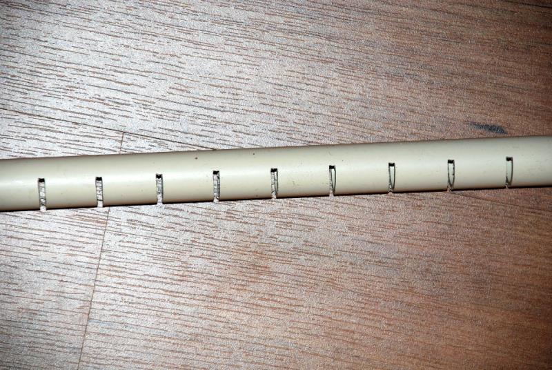 All that wire has to be supported somehow, and I figured the easiest and cheapest way would be to take a length of 1" diameter plastic pipe and cut an evenly spaced series of slots into the pipe. As the pipe was bent around the tree and fastened in place against the tree, the slots would close up slightly as the pipe was bent. This would "put the squeeze" on the wire and hold the coil firmly in place. I drew a series of pencil marks spaced one inch apart on the pipe. The slots were then cut a little more than halfway through the pipe using a carbide tipped saw blade on a table saw. I made a "sled" for the saw to hold the pipe tightly in position as I cut the slots. The use of the sled also kept my fingers well away from the saw blade during the cutting process.
