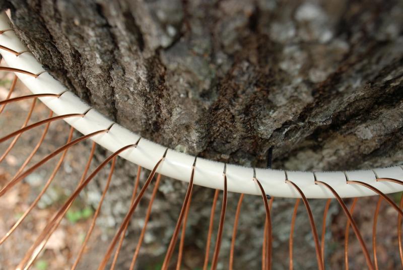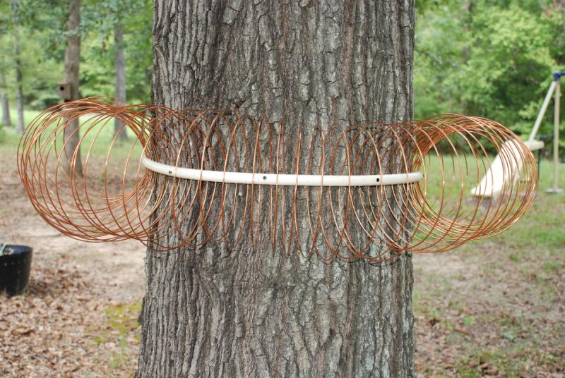 Seen from the other side of the tree, the coupling coil looks a bit better. The black screws that hold the pipe against the tree are not tightened up snugly. You must allow some slack here, or as the tree grows it will crush the pipe and eventually pull the screws right through the pipe, ruining the coil.