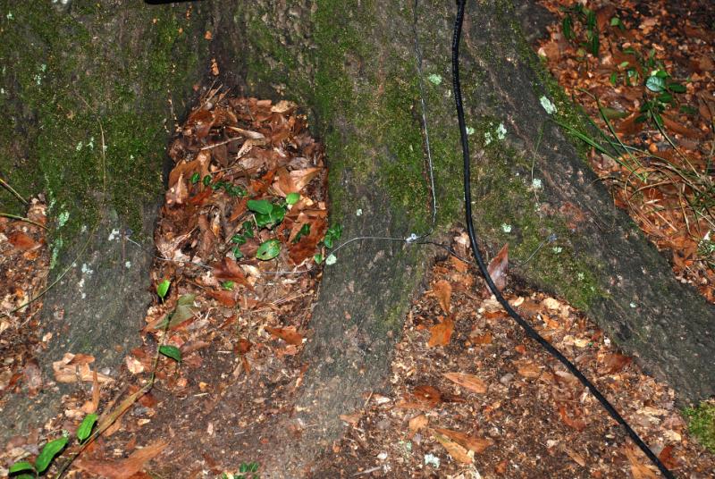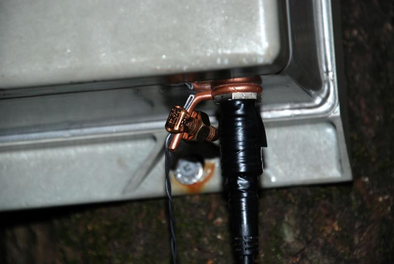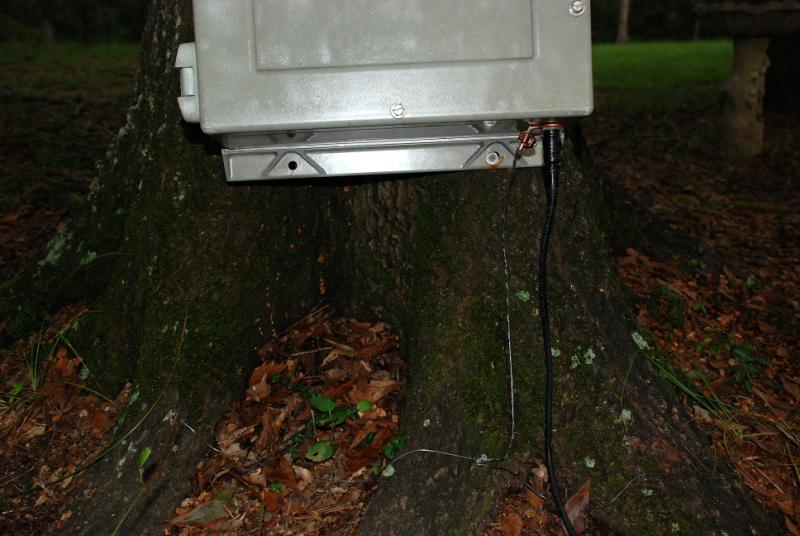 The ground wire goes from the tree roots to the coaxial connector on the bottom of the tuner enclosure.