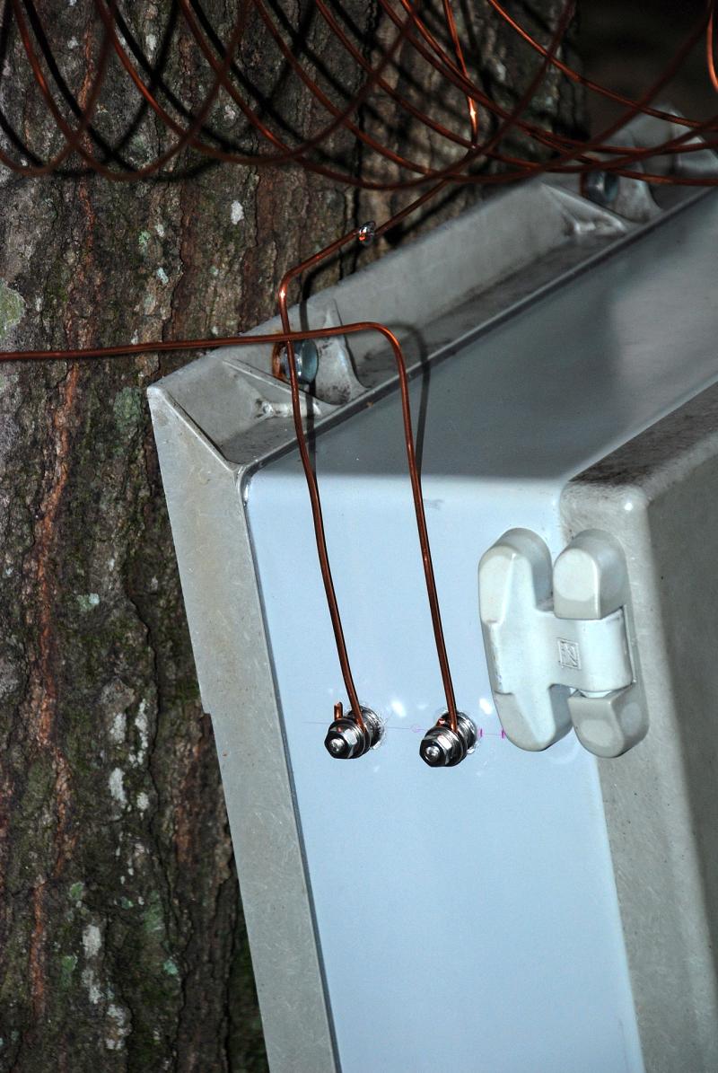 Stainless steel through bolts carry the signals through the Fiberglass walls of the enclosure. Sealer is applied to the bolts so that rain will not enter the enclosure. The bolts that hold the enclosure against the tree are not snugged up tight, there is room for the tree to grow. Both the bolts holding the enclosure to the tree and the screws holding the coupling coil in place will have to be backed out slightly every year or so.