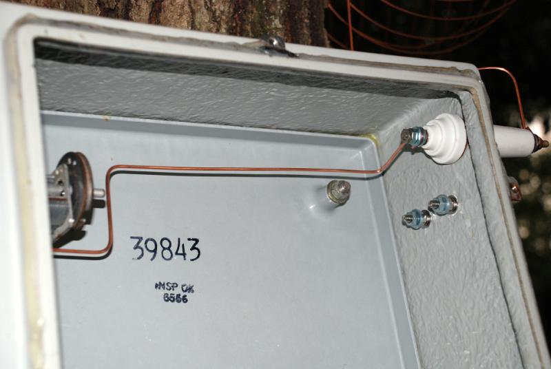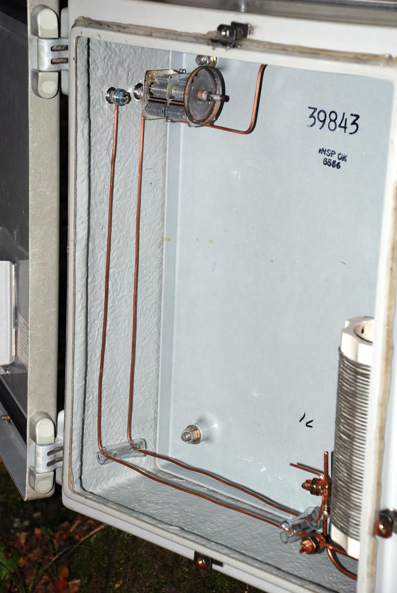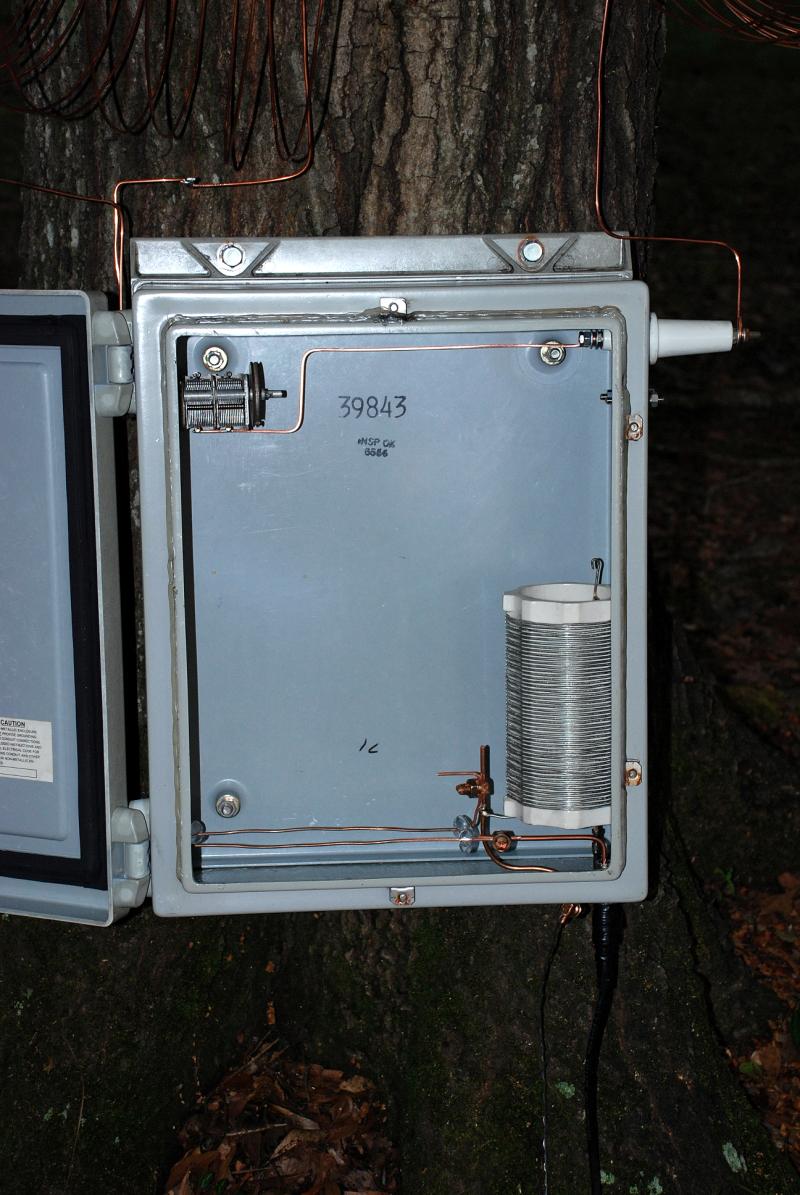 There are two connections visible on the left side of the enclosure. The connection closest to the tree goes to the left ("cold") end of the coupling coil. This end of the coil is also connected to ground. The front-most connection goes to a tap on the coil that is 10 turns from the ground end of the coil. This is the feed point for the 75 Ohm coaxial cable that goes to the receiver in the shack.