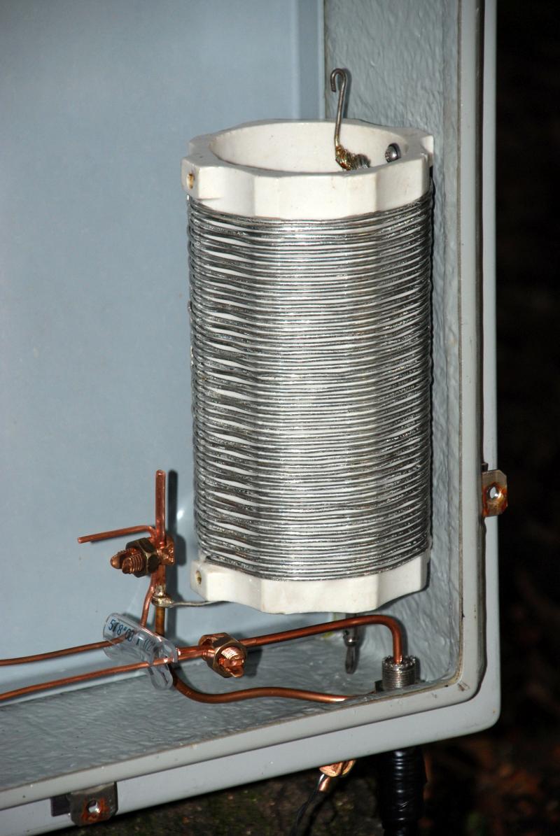 I had previously installed this 100 uH coil in the enclosure to be used as part of a shunt feed tuned for my old tower on 75 Meters.